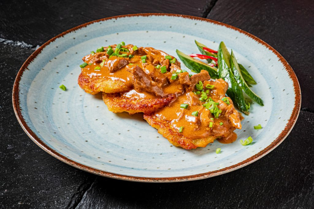 (Русский) драники, говядина, огурцы по-тайски, зелень