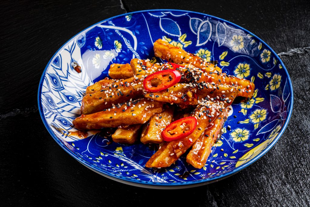 Grilled eggplant rolls with garlic and unagi sauces, sulguni, cherry tomatoes and romaine lettuce.
