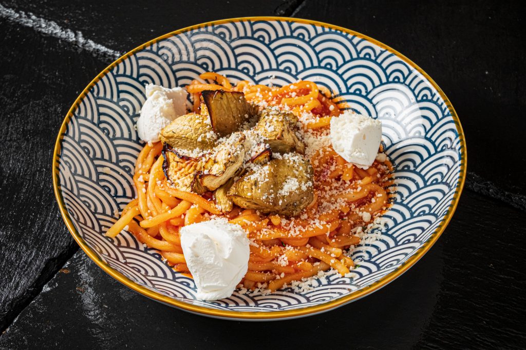Лапша Лагман собственного приготовления, томаты в с/с, запеченный баклажан, творожный сыр, базилик, перец чили.